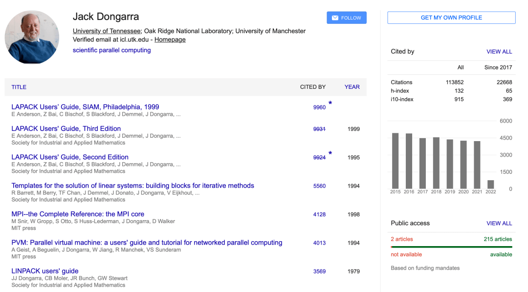 其中,2021年圖靈獎獲得者,美國田納西大學、橡樹嶺國家實驗室和曼徹斯特大學教授,超算TOP500排行榜創(chuàng)始人Jack Dongarra也將出席本次大會并作特邀報告。他的論文被引數(shù)超過11萬,h-index超過130。