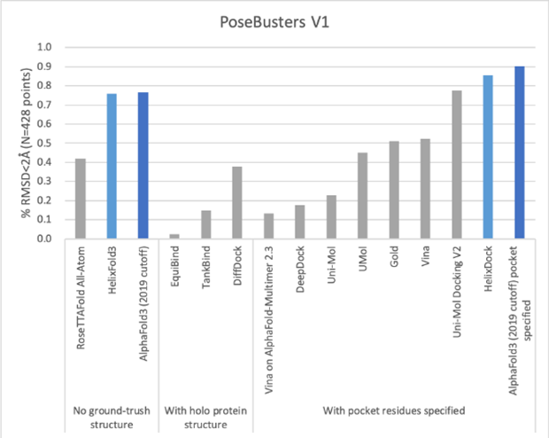 ▲ 圖1 PoseBusters V1數(shù)據(jù)集上AlphaFold3復現(xiàn)工作與同類模型的精度表現(xiàn)