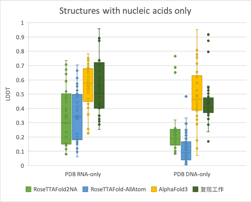 ▲圖5 Alphafold3復現(xiàn)工作與同類模型在PDB RNA-only與PDB DNA-only數(shù)據(jù)集上的LDDT評估值對比