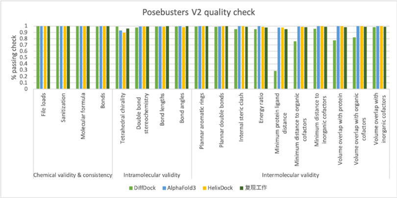 ▲圖3 Alphafold3復現(xiàn)工作與同類模型的PoseBusters V2 quality check精度對比