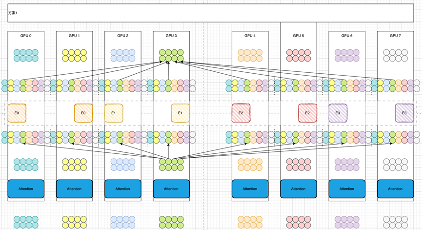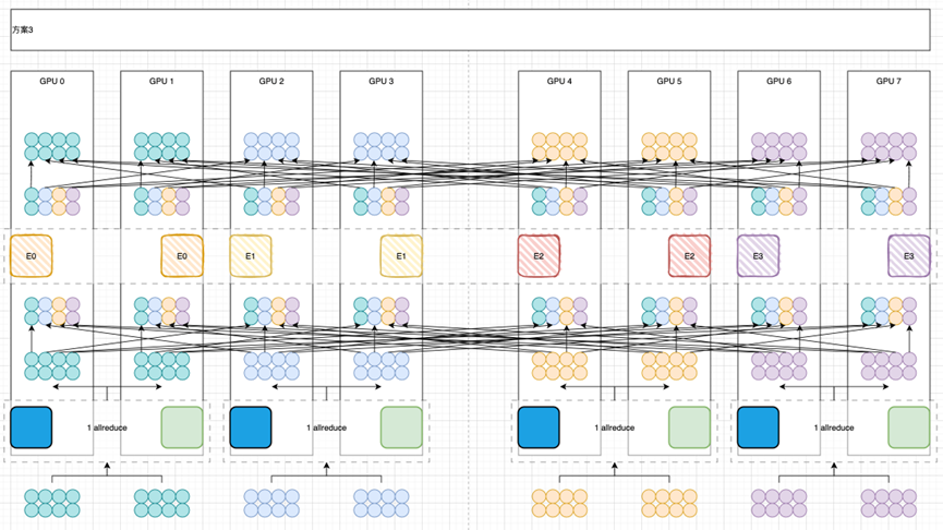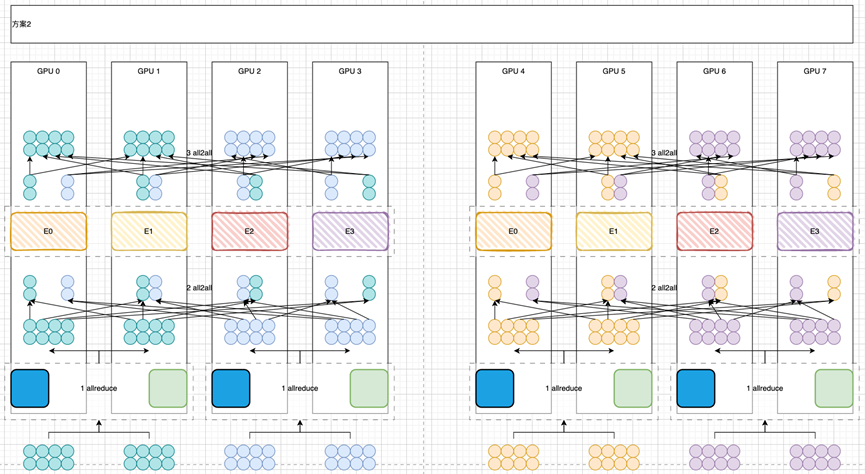 在前向計(jì)算的時(shí)候, Attention部分和之前2個(gè)方案不同,GPU0-GPU1,GPU2-GPU3,GPU4-GPU5,GPU6-GPU7之間需要進(jìn)行Allreduce通信。之后看起來(lái)在MoE部分完成2次All2All操作。細(xì)心的同學(xué)可能已經(jīng)發(fā)現(xiàn),如果按照常規(guī)的All2All操作,第一次會(huì)多發(fā)送1倍的重復(fù)數(shù)據(jù)。第二次進(jìn)行的是一個(gè)類(lèi)似與上一個(gè)方案的All2All操作。 在反向計(jì)算的時(shí)候,GPU0-GPU4,GPU1-GPU5,GPU2-GPU6,GPU3-GPU7的Expert做Allreduce操作,在Attention部分做GPU0-GPU2-GPU4-GPU6和GPU1-GPU3-GPU5-GPU7的Allreduce操作。
