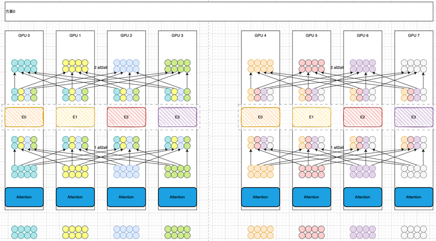 接下來(lái)讓我們稍微進(jìn)階一下。假設(shè)方案0中GPU卡的顯存并不夠。其中一種方案是將Expert維度改變成EP4-TP2,如圖2所示。單機(jī)8卡,4個(gè)專(zhuān)家,Attention部分(藍(lán)色)采用DP8,MoE部分采用EP4-TP2。