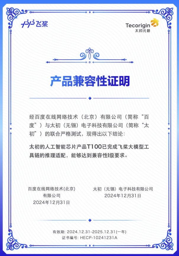 太初T100加速卡完成飛槳大模型工具鏈的兼容性適配測試,通過飛槳官方測試認(rèn)證,滿足推理級要求。