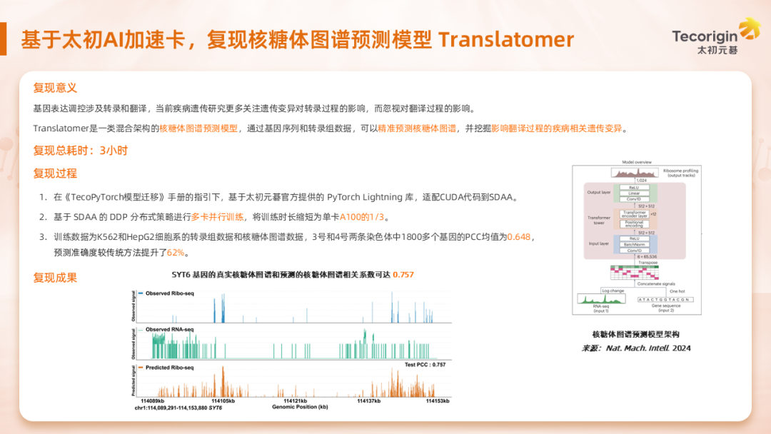 基于TecoPyTorch的高度兼容性和太初元碁已適配的PyTorch Lightning框架,團(tuán)隊(duì)成員在《TecoPyTorch遷移手冊》的指引下,3小時(shí)即完成Translatomer 模型在太初AI加速卡上的復(fù)現(xiàn)。并進(jìn)一步,在TecoPyTorch上開啟了DDP 分布式訓(xùn)練,將訓(xùn)練時(shí)長縮短為單卡A100的1/3。最終,復(fù)現(xiàn)后模型的預(yù)測準(zhǔn)確度較傳統(tǒng)方法提升了62%。