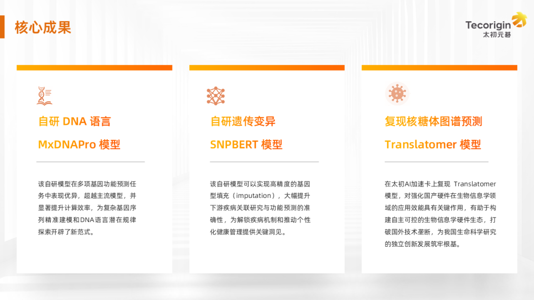 湖南大學(xué)生物學(xué)院計(jì)算基因組學(xué)課題組的羅宵教授帶領(lǐng)團(tuán)隊(duì)與太初元碁開展深度合作,強(qiáng)化國產(chǎn)AI算力在生物信息學(xué)領(lǐng)域的應(yīng)用效能,推動(dòng)構(gòu)建自主可控的生物信息學(xué)硬件生態(tài),打破國外技術(shù)壟斷,為我國生命科學(xué)研究的獨(dú)立創(chuàng)新發(fā)展筑牢根基: