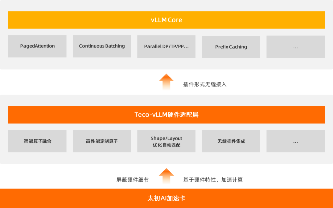 太初元碁基于vLLM框架推出了大模型推理產(chǎn)品——Teco-vLLM,旨在為開(kāi)發(fā)者提供近乎零成本的遷移體驗(yàn),并結(jié)合太初AI加速卡硬件特性,深度優(yōu)化推理性能,助力開(kāi)發(fā)者加速智能應(yīng)用的創(chuàng)新與落地。