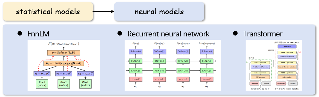 圖2 基于統(tǒng)計(jì)的語言模型和基于神經(jīng)網(wǎng)絡(luò)的語言模型