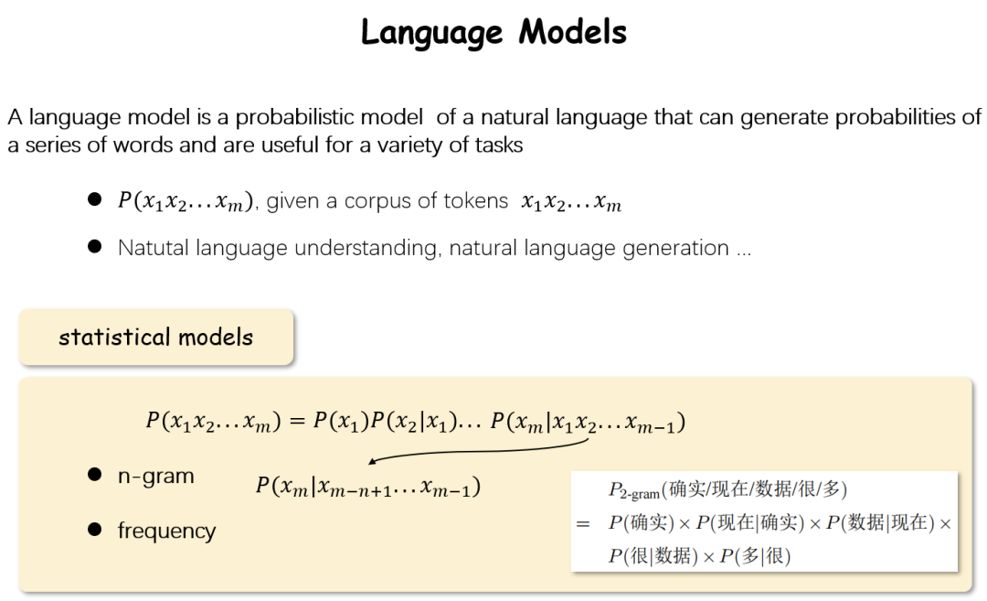 說到LLM就不得不提LM(language model語言模型)。語言模型是這樣一個(gè)模型:對于一句話(由詞組成的序列),它能夠計(jì)算出這句話出現(xiàn)的概率。為了讓模型給出這樣的概率P,最簡單的方法就是將其用概率論中的方法進(jìn)行展開,這樣只要想辦法得到每一個(gè)P(xm|x1x2...xm-1)即可。這樣從另一個(gè)角度來看,如果我們可以找到一個(gè)模型:它能夠計(jì)算P(xm|x1x2...xm-1),那么它就是一個(gè)語言模型。