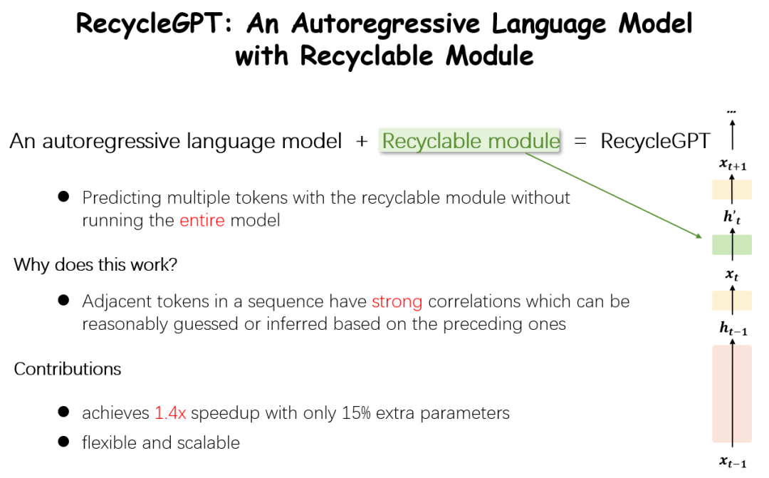為了解決Low parallelizability,我們在8月份提出了RecycleGPT[6],一種可重復(fù)利用模型狀態(tài)加速解碼過程的模型,在近乎無效果損失的前提下,實(shí)現(xiàn)了1.4倍的推理加速,并引起了廣泛關(guān)注。